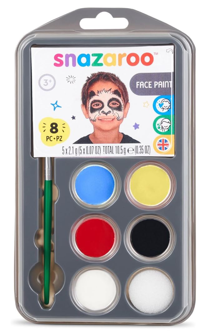 Flott sett sem málar mörg andlit. Inniheldur bláan, gulan rauðan, svartan og hvítan lit auk pensils og svamps. Þá þarf bara vatn allt er klárt!